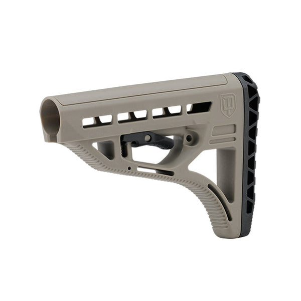 The Ultralite Stock is a collapsible style carbine style stock made specifically for the DAM. It has seven positions of length adjustment to fit a variety of arm lengths. The stock provides an extra wide cheek guard and low stock rod position designed to accommodate any type of mask. A tapered interior stock adjustment pin is used to reduce wobble and improve stability. A Stickygrip butt pad and metal skid plate reduces wear and protects against impacts. All of the weight from the stock has been reduced and it has the ability to fit a variety of tank sizes.